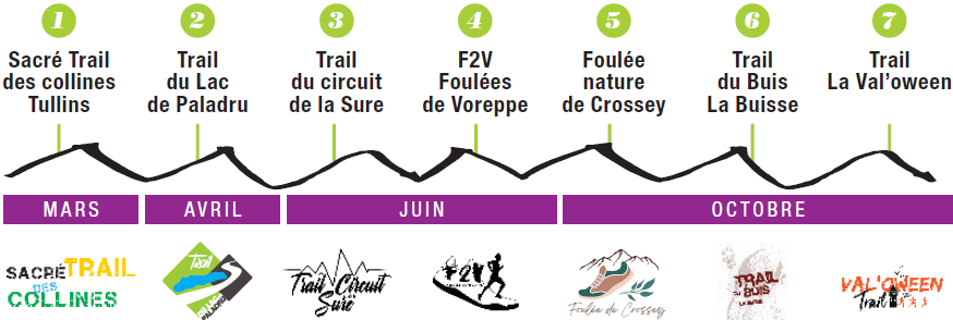 Pour prendre part au challenge individuel, il vous faut participer à au moins 4 des 7 courses du Pays Voironnais Trail Series avec, à la clé, des récompenses pour tous ! Concrètement, inscrivez-vous à chaque course en cliquant sur les liens ci-dessous :